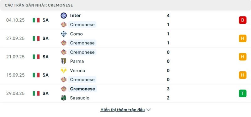 • Phong độ của Cremonese