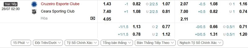 Bảng Tỷ lệ kèo bóng đá Cruzeiro vs Ceará