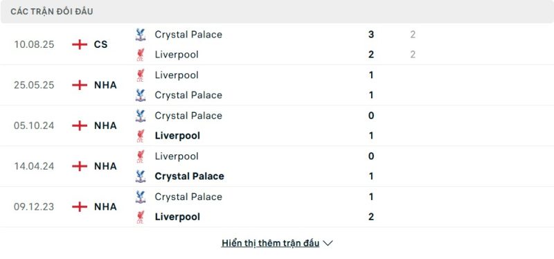 Thành tích đối đầu của Crystal Palace vs Liverpool
