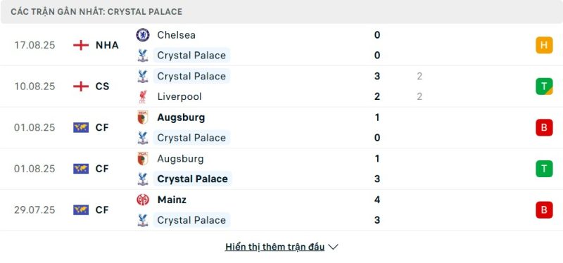 5 trận gần nhất của Crystal Palace: D-D-L-W-L