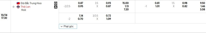 Bảng Tỷ lệ kèo bóng đá Đài Bắc Trung Hoa vs Thái Lan