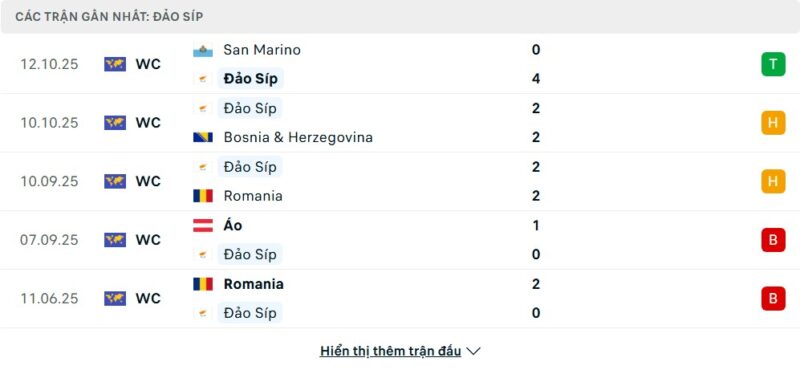 Đảo Síp đang đứng ở vị trí thứ tư tại bảng H và vẫn cho thấy sự nỗ lực đáng kể dù kết quả chưa thật sự ổn định. Họ có hai chiến thắng, hai trận hòa và ba thất bại, trong đó những trận hòa trước Romania và Bosnia là các điểm sáng hiếm hoi. Gần đây, Đảo Síp thể hiện khả năng tận dụng cơ hội khá tốt khi đối đầu San Marino, nhưng lại gặp khó trước các đối thủ mạnh. Màn trình diễn thất thường khiến họ khó chen chân vào nhóm cạnh tranh suất đi tiếp, song tinh thần chiến đấu của đội bóng vẫn đem lại hy vọng có điểm.