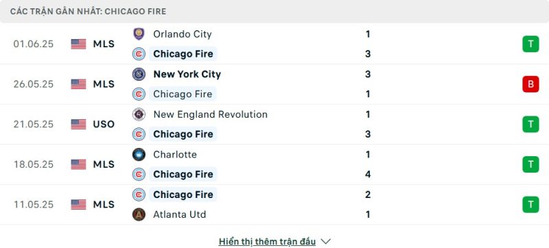 5 trận gần nhất của Chicago Fire: W-L-W-W-W