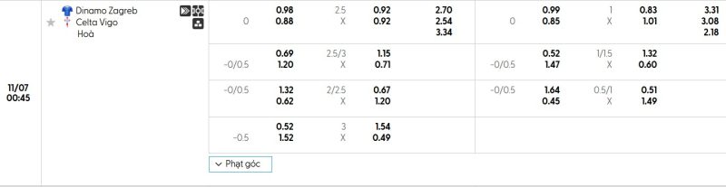 Bảng Tỷ lệ kèo bóng đá Dinamo Zagreb vs Celta Vigo
