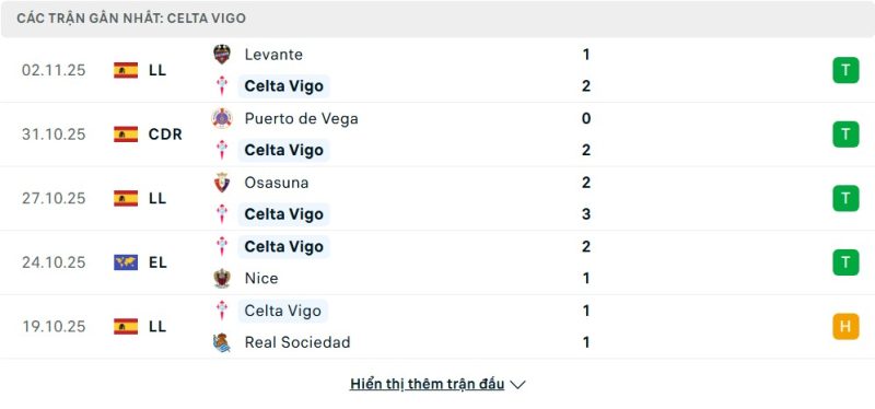 5 trận gần nhất của Celta Vigo: W-W-W-W-D