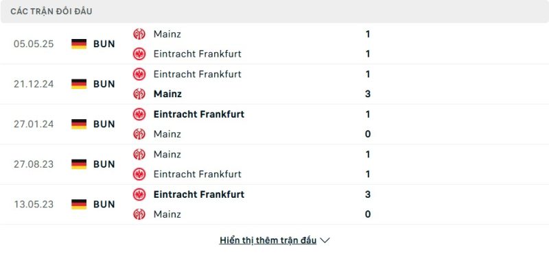 Thành tích đối đầu của Eintracht Frankfurt vs Mainz 05