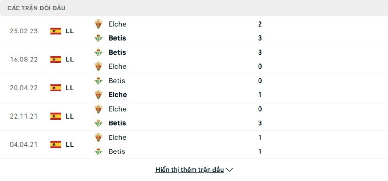 Thành tích đối đầu của Elche vs Real Betis