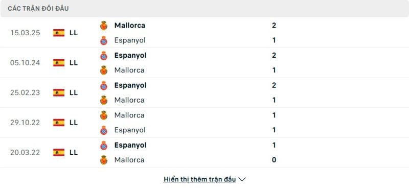 Thành tích đối đầu của Espanyol vs Mallorca