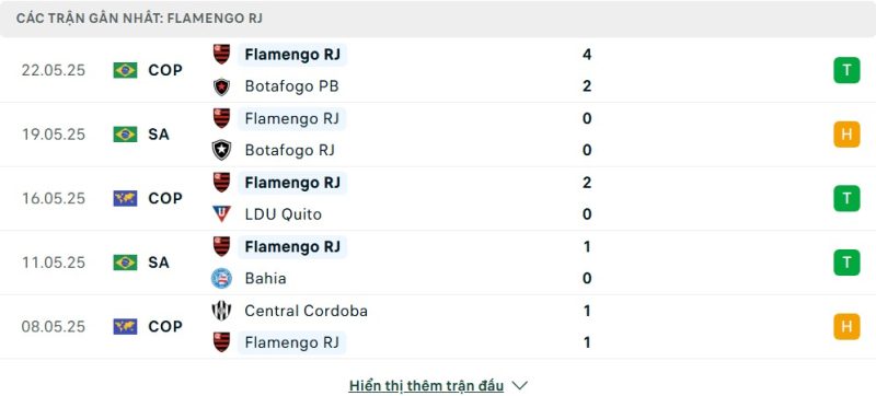 5 trận gần nhất của Flamengo: W-D-W-W-D