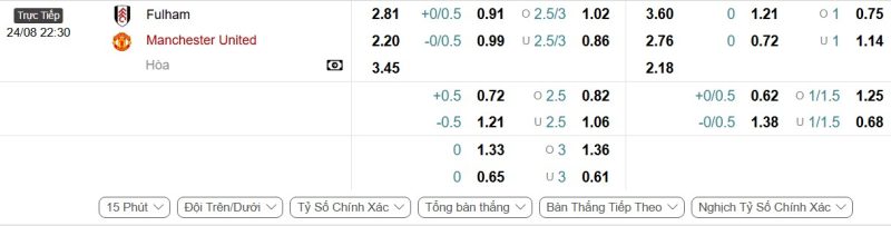 Bảng Tỷ lệ kèo bóng đá Fulham vs Manchester United