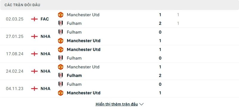 Thành tích đối đầu của Fulham vs Manchester United