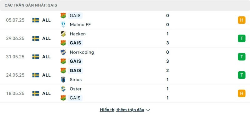 Thống kê phong độ gần đây GAIS vs Hammarby IF