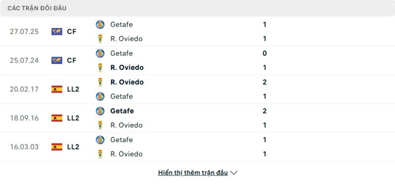Thành tích đối đầu của Getafe vs Real Oviedo