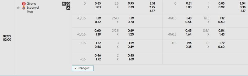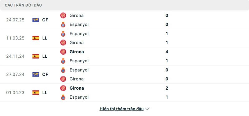 Bảng Tỷ lệ kèo bóng đá Girona vs Espanyol