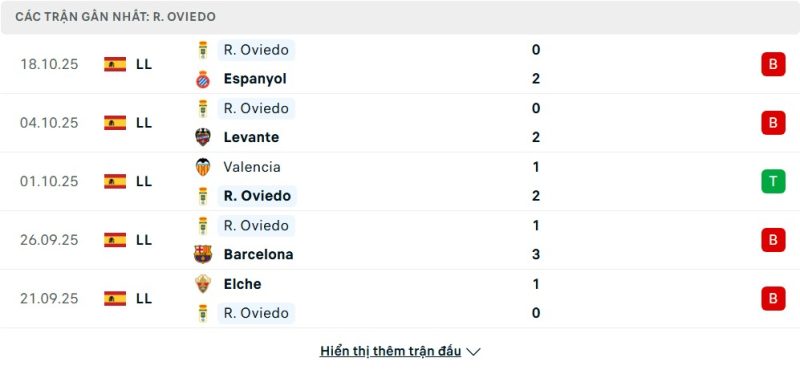 5 trận gần nhất của Real Oviedo: L-L-W-L-L