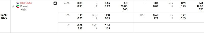 Bảng Tỷ lệ kèo bóng đá Hàn Quốc vs Kuwait