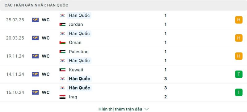 5 trận gần nhất của Hàn Quốc: D-D-D-W-W