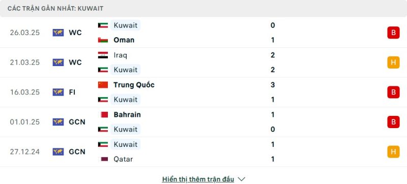 5 trận gần nhất của Kuwait: L-D-L-L-D