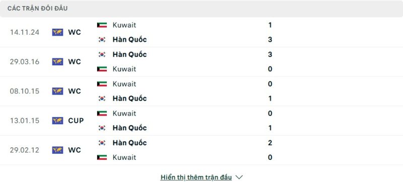 Thống kê phong độ gần đây Hàn Quốc vs Kuwait