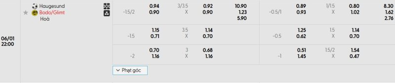 Bảng Tỷ lệ kèo bóng đá Haugesund vs Bodø/Glimt