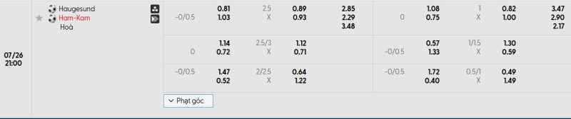 Bảng Tỷ lệ kèo bóng đá Haugesund vs HamKam