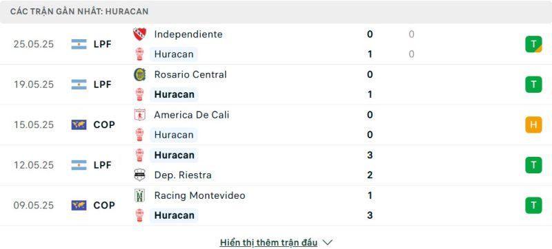 5 trận gần nhất của Huracán: D-W-D-W-W