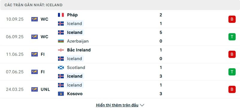 5 trận gần nhất của Iceland: L-W-L-W-L