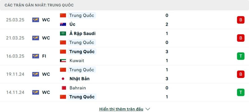 5 trận gần nhất của Trung Quốc: L-L-W-L-W