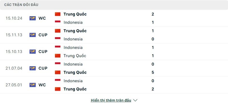 Thành tích đối đầu của Indonesia vs Trung Quốc