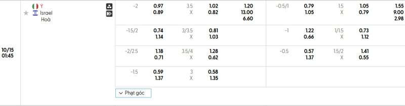 Bảng Tỷ lệ kèo bóng đá Italia vs Israel
