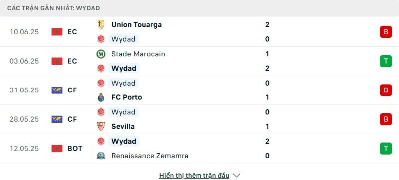 5 trận gần nhất của Wydad Casablanca: L-W-L-L-W