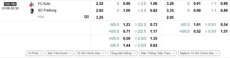 - Kèo tỷ số bóng đá hiệp 1: Köln 2-0 SC Freiburg