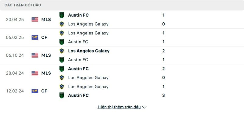 Thành tích đối đầu của LA Galaxy vs Austin FC