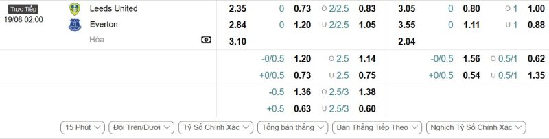 Bảng Tỷ lệ kèo bóng đá Leeds United vs Everton