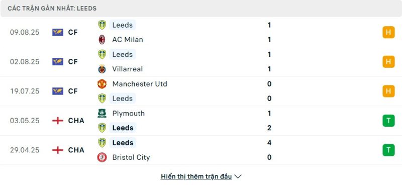 Leeds United đang có phong độ khá tốt khi bước vào mùa giải mới. Trong các trận giao hữu, họ duy trì được sự ổn định với các kết quả hòa trước Milan, Villarreal và Manchester United. Trước đó, tại Championship mùa trước, Leeds khép lại bằng chuỗi thắng ấn tượng trước Plymouth, Bristol City, Stoke, Oxford United và Preston. Lối chơi cân bằng giữa tấn công và phòng ngự giúp đội bóng này tạo được niềm tin lớn cho người hâm mộ trước thềm mùa giải Ngoại hạng Anh 2025/26.