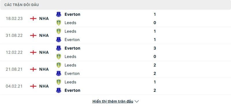 Thành tích đối đầu của Leeds United vs Everton