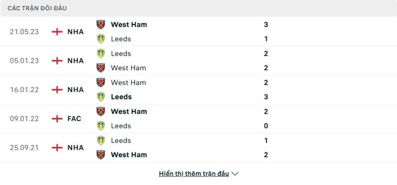 Thành tích đối đầu của Leeds United vs West Ham United