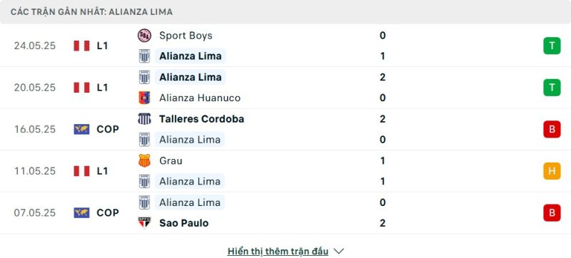 5 trận gần nhất của Alianza Lima: W-W-L-D-L