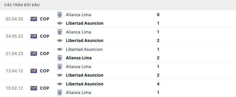 Thành tích đối đầu của Libertad vs Alianza Lima