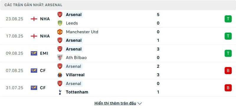 5 trận gần nhất của Arsenal: W-W-W-L-L