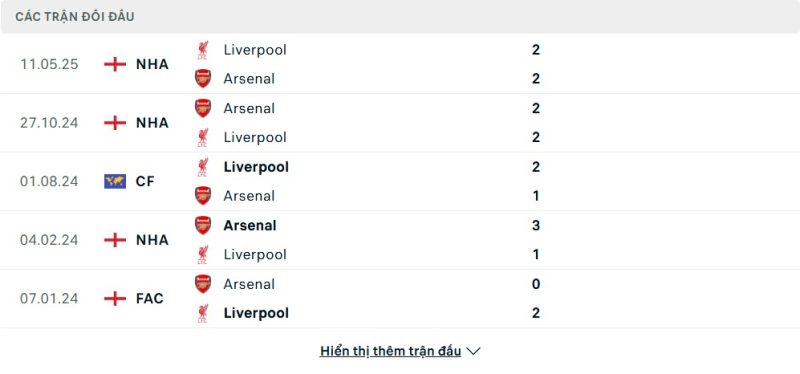 Thống kê phong độ gần đây Liverpool vs Arsenal