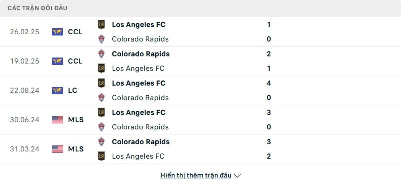 Thành tích đối đầu của Los Angeles FC vs Colorado Rapids