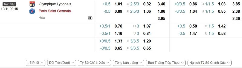 Bảng Tỷ lệ kèo bóng đá Lyon vs Paris Saint-Germain