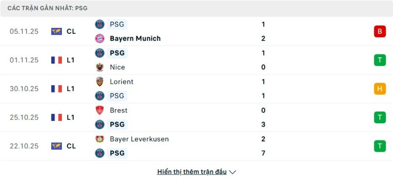 Thống kê phong độ gần đây Lyon vs Paris Saint-Germain