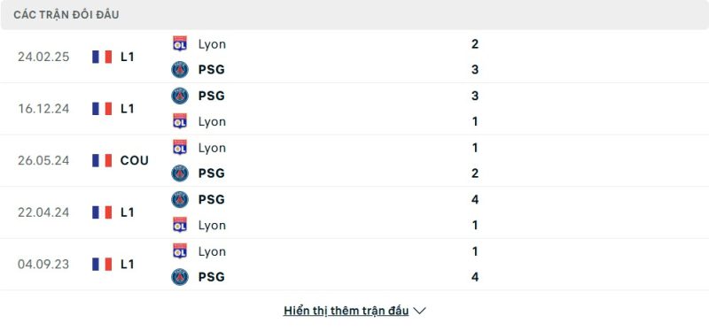 Thành tích đối đầu của Lyon vs Paris Saint-Germain