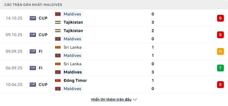 5 trận gần nhất của Maldives: L-L-D-W-L