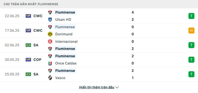 5 trận gần nhất của Fluminense: W-D-W-W-W