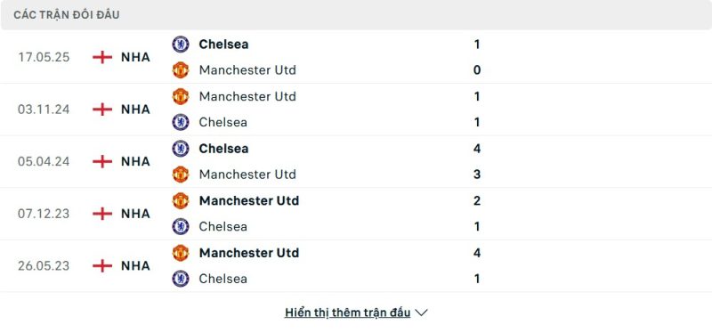 Thành tích đối đầu của Manchester United vs Chelsea
