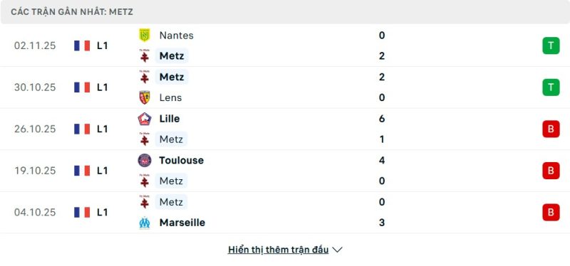 Metz đang trải qua một mùa giải đầy khó khăn khi hiện đang kẹt ở vị trí thứ 17 trong nhóm cầm đèn đỏ, chỉ với 8 điểm sau 11 vòng đấu. Họ là một trong những đội có hàng thủ tệ nhất giải, đã để thủng lưới tới 26 bàn. Tuy nhiên, tín hiệu lạc quan bất ngờ đã đến với thầy trò HLV Stephane Le Mignan. Sau chuỗi 5 trận thua liên tiếp thảm hại, bao gồm cả thất bại 1-6 trước Lille, Metz đã bất ngờ hồi sinh. Họ vừa có hai chiến thắng liên tiếp cùng tỷ số 2-0 trước Lens và Nantes, giữ sạch lưới ấn tượng, cho thấy sự cải thiện đáng kể.
