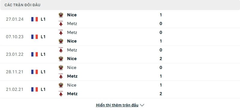 Thành tích đối đầu của Metz vs Nice